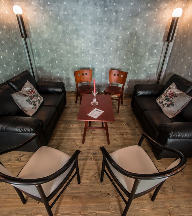 Stylově zařízený prostor s elegantním nábytkem, sedačkami a decentní výzdobou. Ideální pro menší společenské události, svatební obřady, degustace nebo komorní oslavy.